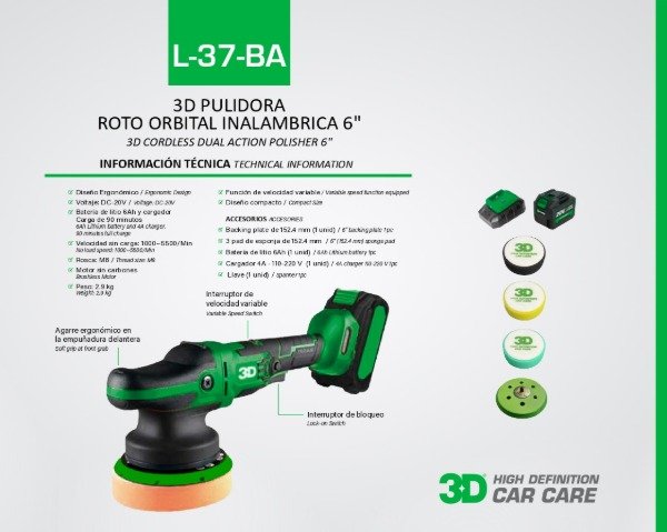 Lleva el brillo de tu vehículo a otro nivel con la Pulidora Roto Orbital Inalámbrica L-37BA de 3D High Definition Car Care. Su movimiento de doble acción (roto orbital) es ideal tanto para principiantes como para profesionales, ya que garantiza un acabado libre de hologramas y marcas (swirls) de forma segura y eficiente.